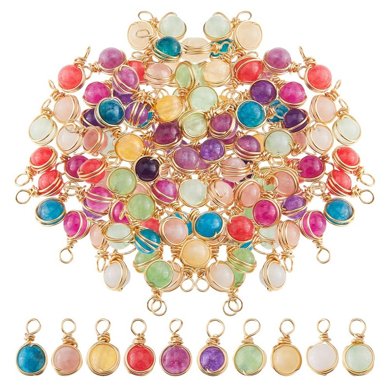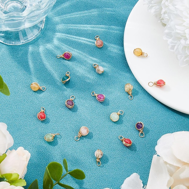 SUPERFINDINGS 60Pcs 10 Colors Natural Stone Pendants Round Pendants Quartz Crystal Stone Charms Beads Charms Gold Copper Wire Wrapped Pendants for DIY Jewelry Making