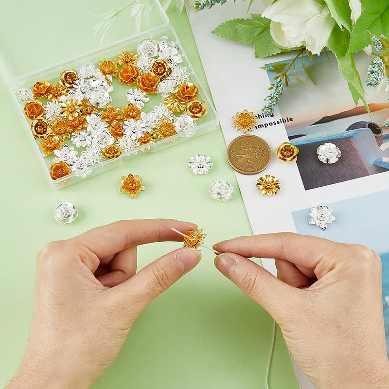 SUPERFINDINGS 60Pcs 10 Styles Flower Bead CAPss Golden Silver Brass Lotus Flower End CAPss Multi Petal Round Filigree Spacer Beads CAPss Hole 0.7~1mm