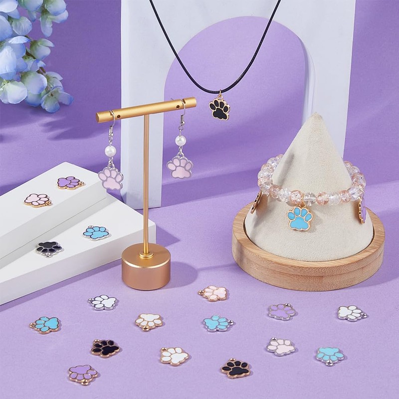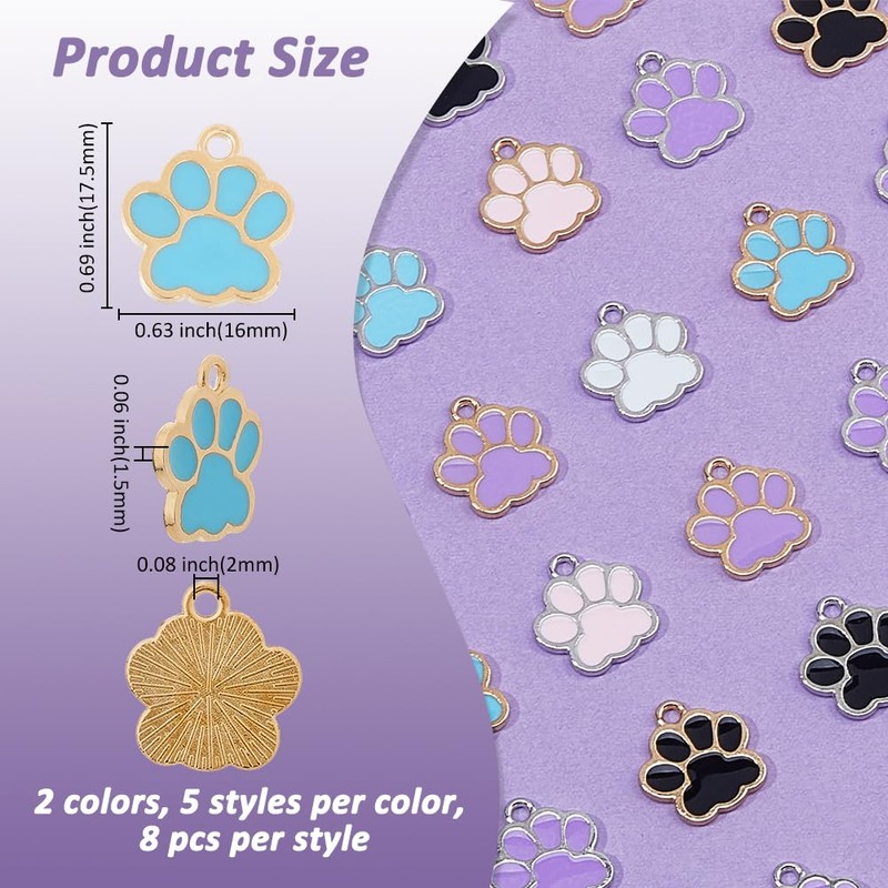 - 5 colours 10 styles: there are a total of 80 paw print pendants, with black, pink, mauve, white, and sky blue in the enamel area, and gold and silver in the metal. There are 5 of each style.
