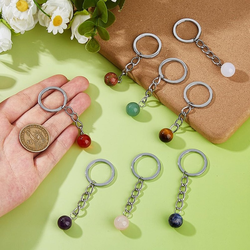 SUPERFINDINGS 8Pcs Gemstone Keychain Natural Crystal Bead Keychain Round Quartz Crystal Pendants with Iron Key Rings for Handbag Purse Car Keys Birthday Party Favors Supplies