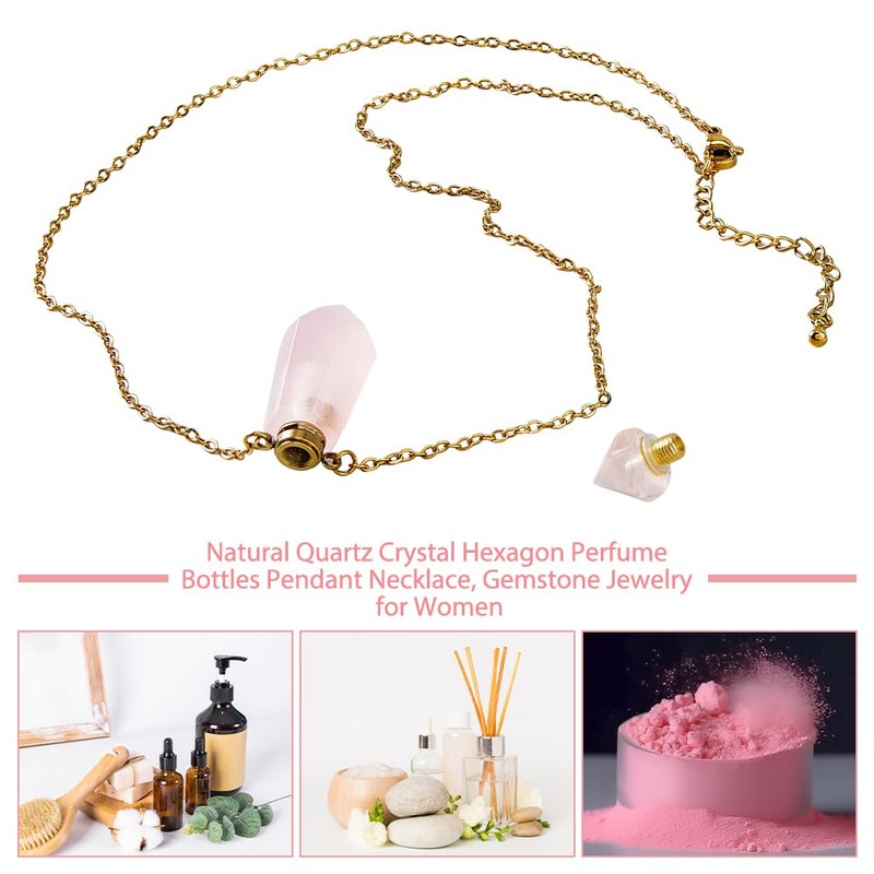 SUPERFINDINGS Natural Rose Quartz Stone Perfume Bottle Pendant Gemstone Crystal Perfume Bottle Essential Oil Necklace Diffuser Necklace Hexagonal Pointed Reiki Chakra Pendant for Woman Men