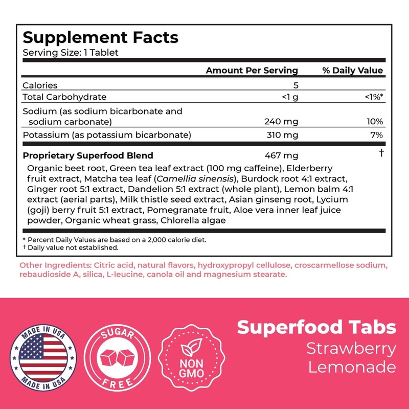 - ? HIGH ENERGY and ZERO SUGAR - Superfood Tabs do not contain sugar. It's lightly sweetened with stevia. Each tablet is just 5 calories, 0g of sugar, and less than 1g of carbs. Superfood Tabs has caffeine from green tea. The Strawberry Lemonade has 100mg of caffeine.