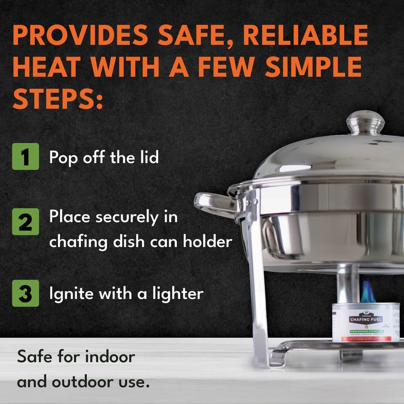 - Spill-Resistant & Easy to Use – No mess, no stress. The chafing dish fuel formula won’t spill or splash, making it a safe, reliable way to keep food at the perfect temperature without the unpredictability of open flames.