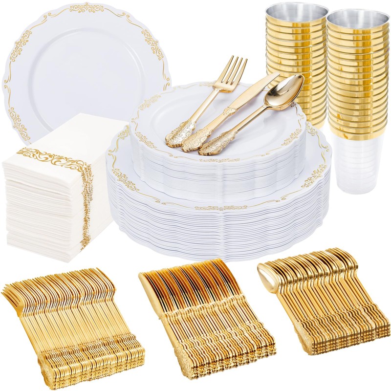 Supernal 210Pcs White and Gold Plastic Dinnerware Set,Disposable Plates and U...