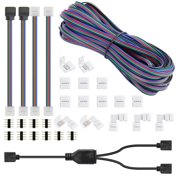 SUPERNIGHT LED Light Strip Connector 4 pin 10mm for 5050 2835 RGB Rope Lights, 1 to 2 Way Splitter Cable, 32.8ft / 10M Extension Wire, Solderless Jumpers 90 Degree Connector, Male to Female 4 Pin Kit