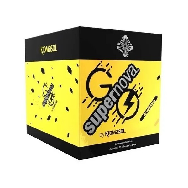 Supernova Go By Kromasol® Caja 36 Sobres De 16g C/u Mango Este producto contiene todas las propiedades de Supernova en una innovadora presentación en GEL listo para ser consumido y llevado a cualquier lugar para activar tu día al máximo. Te proporcionará Energía Constante, ideal para rendir al máximo en tus Actividades Físicas y Mentales, gracias a su fórmula adicionada con Extractos naturales, Complejo B y Minerales. Supernova GO en su nueva práctica presentación, te permitirá llevarlo a todas partes y poderlo tomar en cualquier momento del dia, ya sea para rendir en tus actividades laborales, deportivas, o del día a dia. Su delicioso sabor a MANGO MARACUYÁ te encantará además de sus múltiples beneficios que tendrás al tomarlo todos los dias. Los ingredientes de Supernova GO te proporcionarán la energía necesaria y podrás consumirlos las veces que quieras en el momento que tu energía baje y quieras darle un extra a tus actividades. Prueba Supernova GO y amarás su sabor y todos sus beneficios.