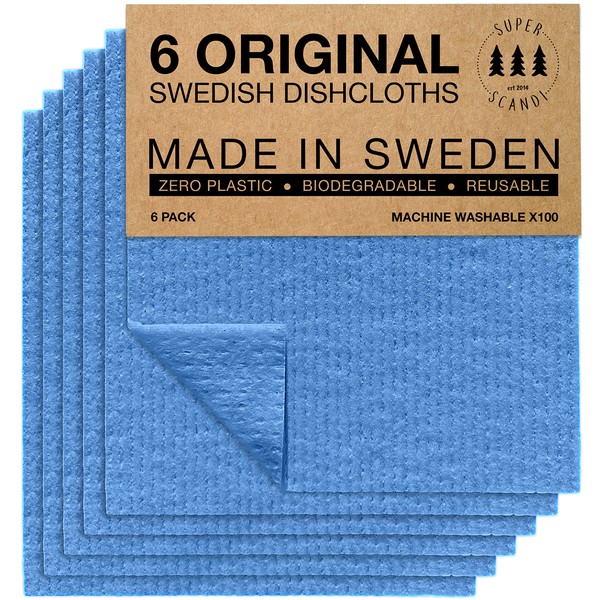 SUPERSCANDI Made in Sweden Dish Cloths Eco-Friendly Paper Alternative Blue 6 Pack Reusable Compostable Kitchen Dish Cloths & Rags