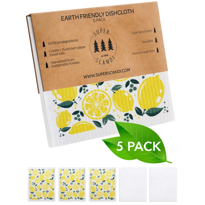 Superscandi Swedish Tea Towels, Eco-Friendly Reusable Sustainable Biodegradable, Pack of 5, Lemon (3 Patterned, 2 White)