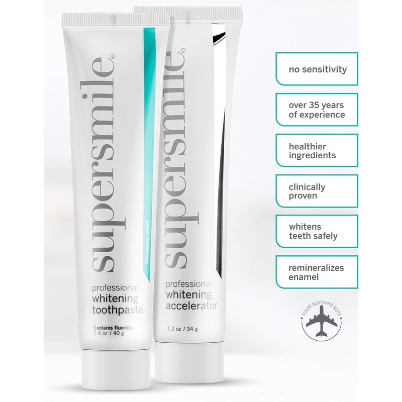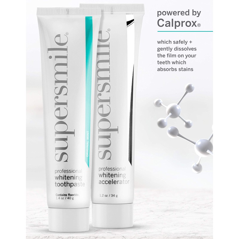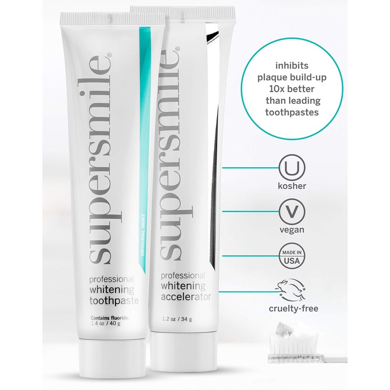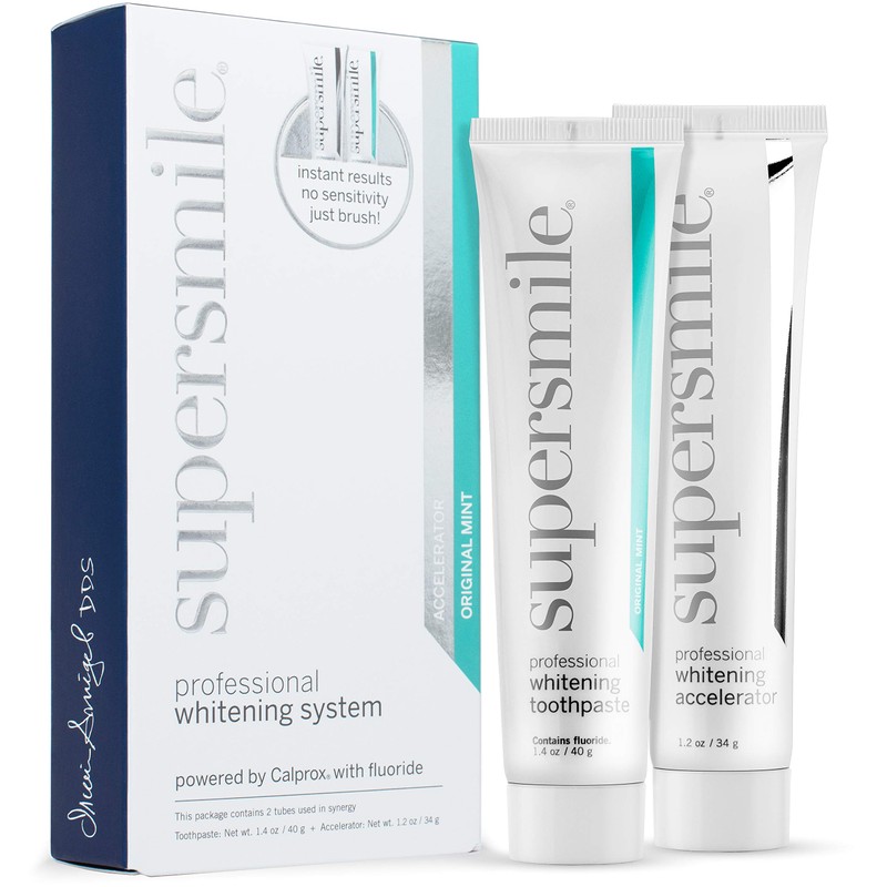 Get the brilliant smile you've always dreamed of with Supersmile's Professional Teeth Whitening System. Developed by Dr. Irwin Smigel, world- renowned "Father of Aesthetic Dentistry", Supersmile is the number one teeth whitening brand recommended by cosmetic dentists. Designed to whiten teeth and improve oral health with every use, this whitening toothpaste & accelerator combo harnesses the power of Calprox, a proprietary formula of encapsulated calcium peroxide. Calprox gently and effectively dissolves sticky biofilm from teeth, safely lifting and removing stubborn surface stains such as coffee, tea, or red wine, and inhibiting plaque buildup 10x better than leading plaque-removing toothpastes without sensitivity. The included whitening gel contains safe, yet potent, whitening agents such as carbamide peroxide, lifting deep set stains and speeds up the whitening process. No harsh abrasives means a healthier enamel, and the inclusion of fluoride, calcium, and phosphates help build additional strength while protecting against cavities. Supersmile's premier whitening blend is also safe and incredibly effective at restoring artificial tooth surfaces, such as bonding, veneers, laminates, and dentures, to their original shade. To use, place a pearl-size drop on a DRY toothbrush of both the professional whitening toothpaste and accelerator. Brush in circular motions for two minutes, twice daily. If you've been looking for a proven way to get a vibrant smile, Supersmile will help you achieve it. Contains no silica, parabens, sulfates, known allergens, animal by-products, or BPA. Kosher. Made in USA. 1-month supply when used as directed.