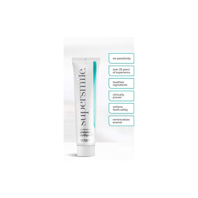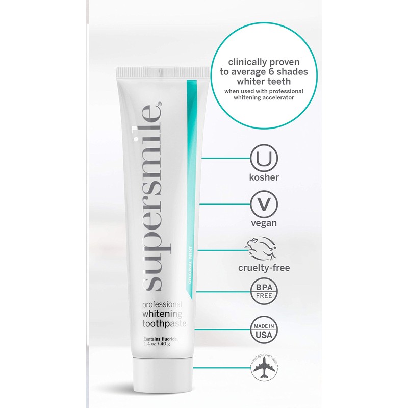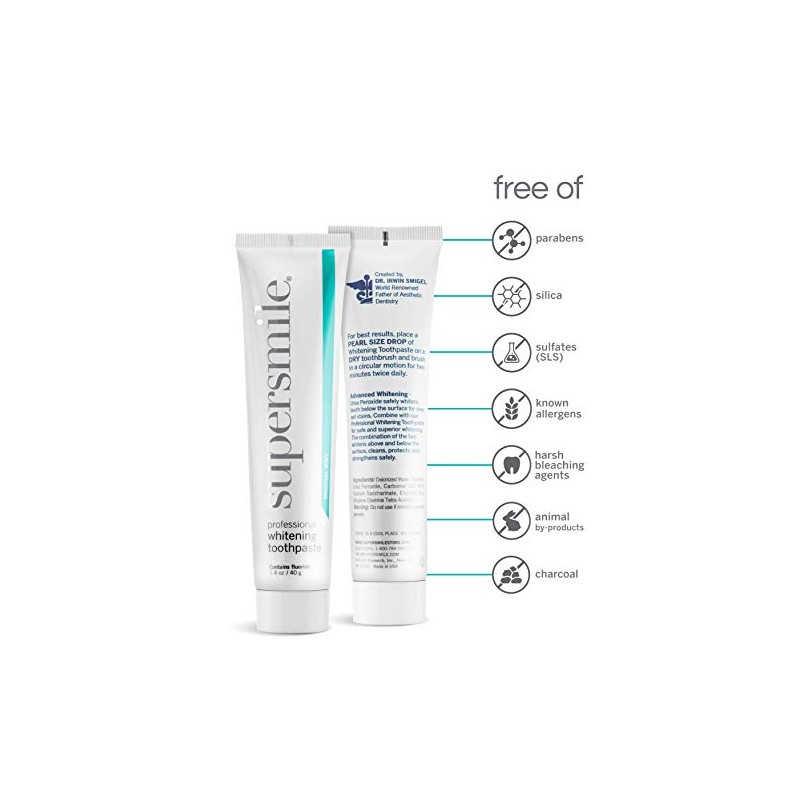 Get the brilliant smile you've always dreamed of with Supersmile's Professional Whitening Toothpaste. Developed by Dr. Irwin Smigel, world- renowned "Father of Aesthetic Dentistry", Supersmile is the number one teeth whitening brand recommended by cosmetic dentists. Designed to whiten teeth and improve oral health with every use, this whitening toothpaste harnesses the power of Calprox, a proprietary formula of encapsulated calcium peroxide. Calprox gently and effectively dissolves sticky biofilm from teeth, safely lifting and removing stubborn surface stains such as coffee, tea, or red wine, and inhibiting plaque buildup 10x better than leading plaque-removing toothpastes without sensitivity. No harsh abrasives means a healthier enamel, and the inclusion of fluoride, calcium, and phosphates help build additional strength while protecting against cavities. Supersmile's premier whitening blend is also safe and incredibly effective at restoring artificial tooth surfaces, such as bonding, veneers, laminates, and dentures, to their original shade. If you've been looking for a proven way to get a vibrant smile, Supersmile will help you achieve it. Contains no silica, parabens, sulfates, known allergens, animal by-products, or BPA. Kosher. Made in USA. For best results use twice per day with Supersmile Professional Whitening Accelerator. 1-month supply when used as directed.
