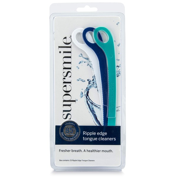 Developed by Dr. Irwin Smigel, world-renowned "Father of Aesthetic Dentistry", Supersmile is the number one teeth whitening brand recommended by cosmetic dentists. Part of a thorough oral health care regimen, a tongue cleaner is the most effective way to remove bacteria that causes bad breath, gum line cavities, plaque and gum disease. Supersmile's Ripple Edge Tongue Cleaner is a simple, yet effective way to eliminate the harmful bacteria and plaque that can lead to sickness and are the cause of over 85% of bad breath. The ripple edge design effectively removes the harmful buildup of bacteria meaning less sick time throughout the year - especially during cold and flu months. The custom, ergonomic design makes it easy to use while the soft resin coating ensures its flexibility, allowing the cleaner to reach far back towards the base of the tongue where the majority of the bacteria resides. By using the recommended two swipes of the tongue, the custom ridges lift trapped bacteria and leftover food particles from the surface. After use, simply rinse with warm water. Like a toothbrush, this tongue cleaner should be replaced every three months. 3 Pack.