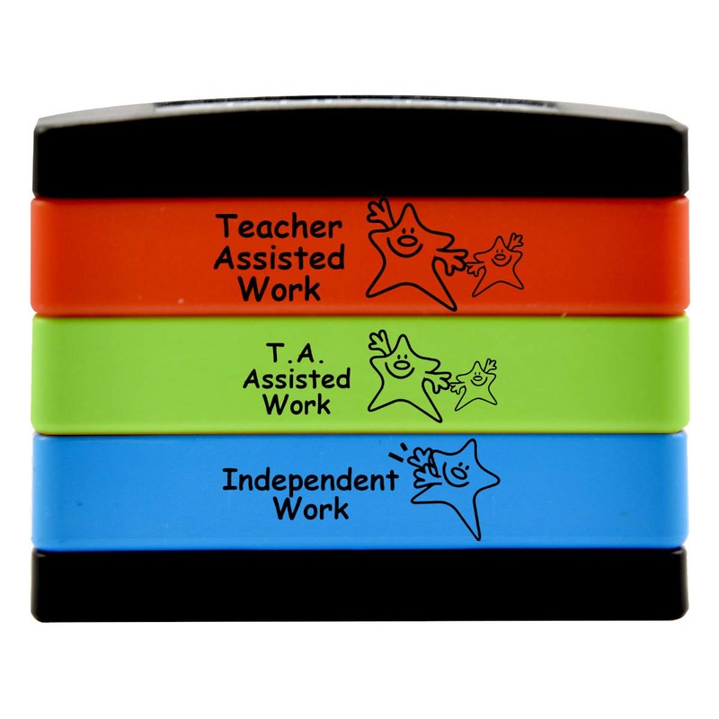 SuperStickers Multi Message 3-in-1 Stamp Stack for Teachers: Teacher Assisted Work/TA Assisted Work/Independent Work in Green, red and Blue Ink.