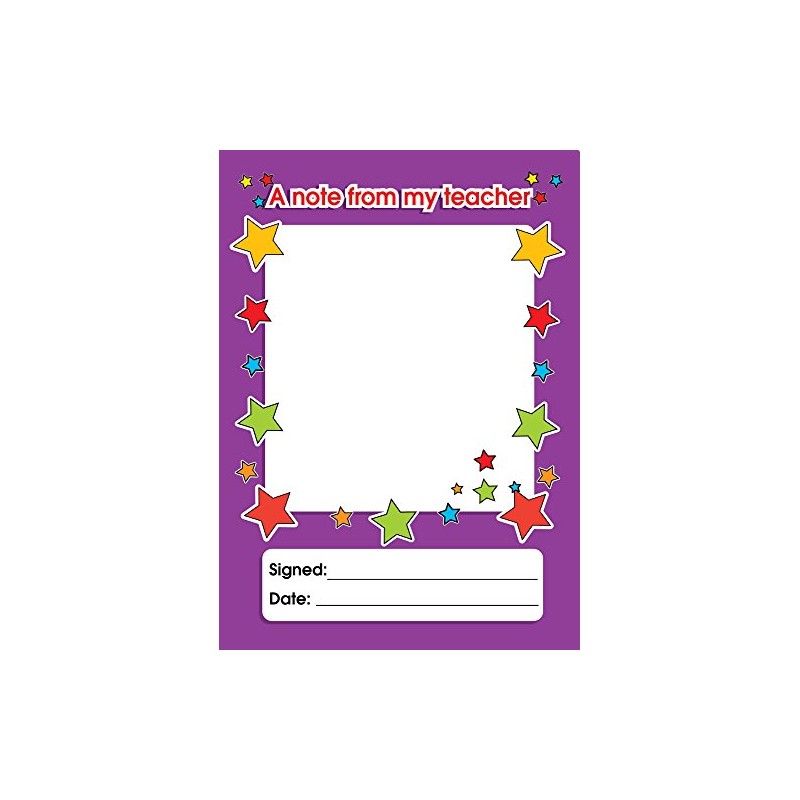 - Encourage your pupils with a note from their Teacher that is quick to write, telling the parents that their child worked very hard today! With multicoloured stars and a purple background.