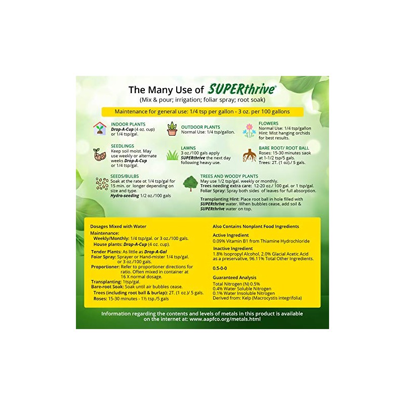 • Easy To Mix & Use - Just add ¼ tsp of SuperThrive to 1 gal of water to hydrate the plant’s base.
