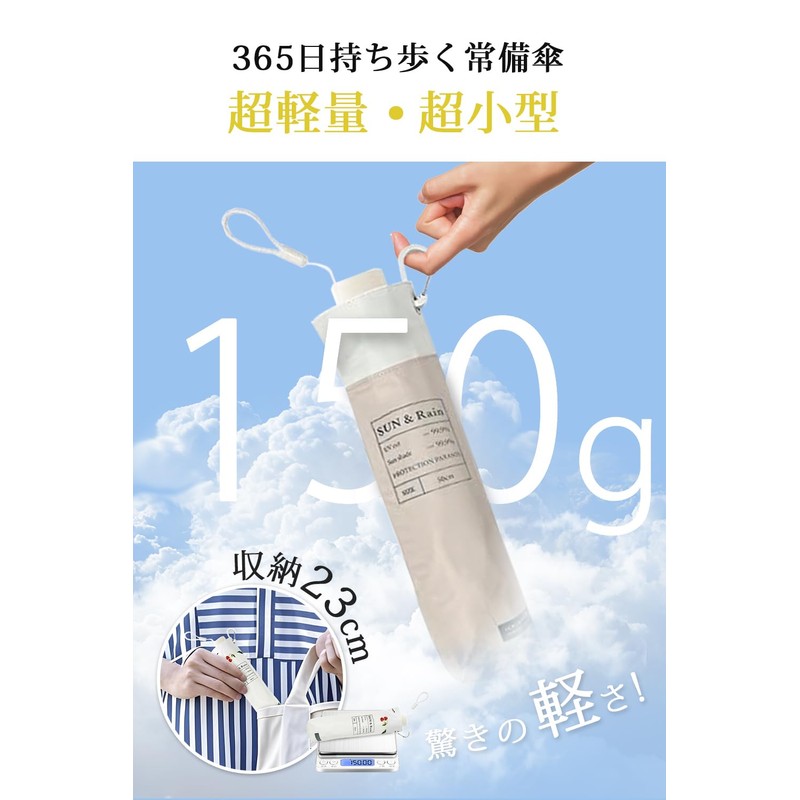 • (Incredibly lightweight! Ultra lightweight umbrella at only 5.0 - 5.3 oz (140 - 150 g) for both sun and rain: We use carefully selected materials that are typically only used in luxury umbrellas, and achieves a super lightweight weight of only 5.0 - 5.3 oz (140 - 15It is about half the weight of a smartphone and is so light that you will forget you are carrying it in your bag. This folding parasol can be stress-free and portable for daily commuting or going out. The compact design is approximately 8.5 inches (21.5 cm) long when stored, and the diameter is only about 1.2 inches (3 cm), so it fits neatly in a mini shoulder bag or pouch. This ultra lightweight umbrella is perfect for everyday use and for both sunny and rain