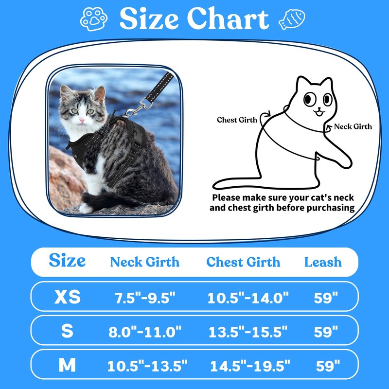 - 【Cat Leash and Harness Set】 You can get includes 1*kitten harness and 1* 5ft cat leash for this item, please make sure the chest and neck girth size before purchasing, If you have any questions, please feel free to contact us, we are glad to solve any of your problems.