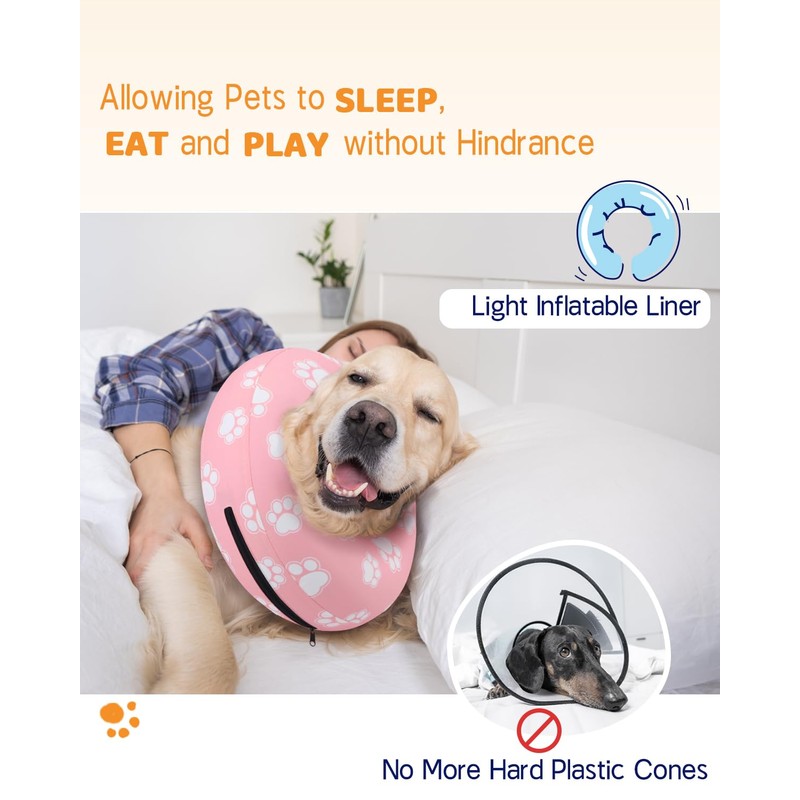 - STRESS FREE - We all know how pets hate the cumbersome cone, poor dogs and cats would keep tripping on it and could not get around. This inflatable cone e collar for dogs WON'T let that happen, the inner air bag provides full support for the neck while keeping it lightweight. It does not block dog’s vision like traditional Elizabethan collar, which allows your doggie chase butterflys, hummers and grass hoppers all with wearing its collar.