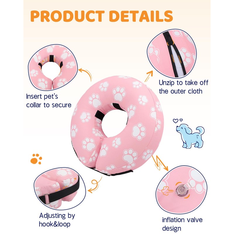Description: This inflatable dog cone is a perfect dog cone alternative after surgery, works like a plump barrier around your canine's neck, can effectively prevent your pets from biting and licking injured area or surgical site. The inner air bag provides full support for the neck while keeping it lightweight. It does not block dog’s vision like traditional recovery collar, which allows your doggie eat, sleep and play as usual.