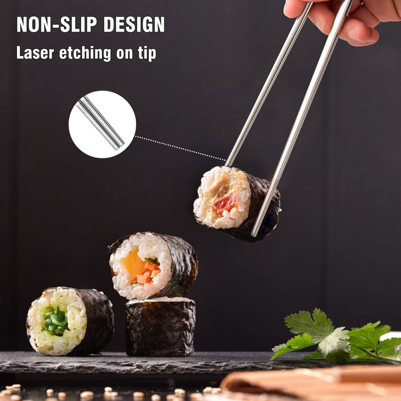 SUPJOYES Stainless steel chopsticks are highly polished, smooth surface, easy to clean, washable by hand or in the dishwasher. The non-slip design allows you to easily grip the food. And the pattern is beautiful and minimalist style, which is very suitable for Asian cuisine such as sushi, pasta and rice. The exquisite gift box with 5 pairs of chopsticks looks elegant and elegant, it is perfect as a gift for your friends or family.