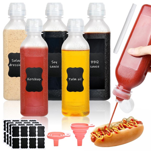 - PCKAGE CONTAINS: In the package, you will receive 5 pieces 16.9 oz / 500ml condiment squeeze bottles with 40 black chalk labels, 2 silicone funnels to help refill the bottle and white marker, sufficient qualities meet your daily use and store variety of colored sauces in the kitchen.