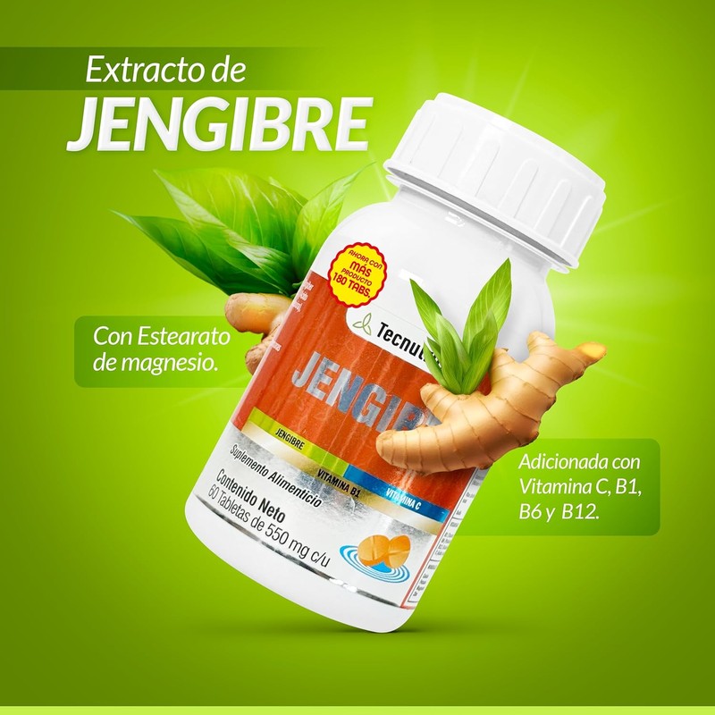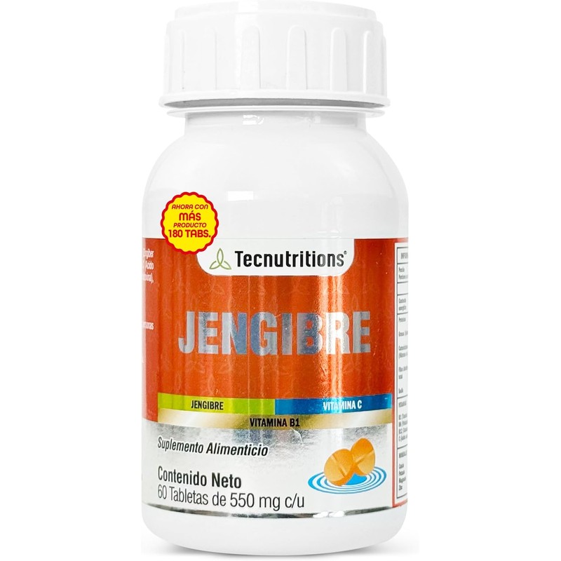 Suplemento alimenticio de Jengibre con Vitaminas C, B1, B6 y B12 – Presentacion con 180 Tabletas | Apoya Energía, Digestión, Defensas Naturales del cuerpo y Bienestar Integral. con 550 mg c/u. TECNUTRITIONS.