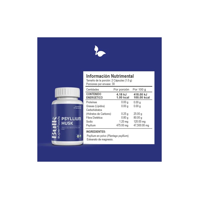 Suplemento Alimenticio en Cápsulas a Base de Psyllium Husk Orgánico 60 Cápsulas De 500 Mg Bulk Superfoods Sin Gluten