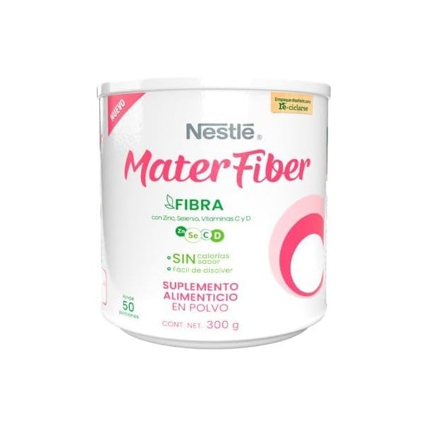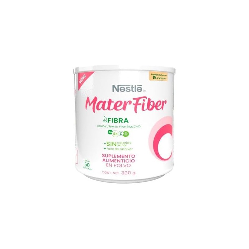 - Nestlé MaterFiber es un suplemento alimenticio. Fibra con Zinc, Selenio, vitamina C y D. Contiene 5 g de fibra, vitaminas y minerales. Sin calorías, sin sabor. Fácil de disolver.