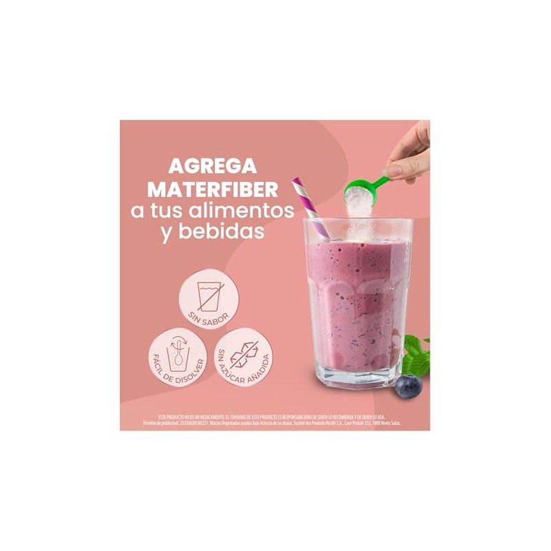 - Nestlé MaterFiber es un suplemento alimenticio. Fibra con Zinc, Selenio, vitamina C y D. Contiene 5 g de fibra, vitaminas y minerales. Sin calorías, sin sabor. Fácil de disolver.