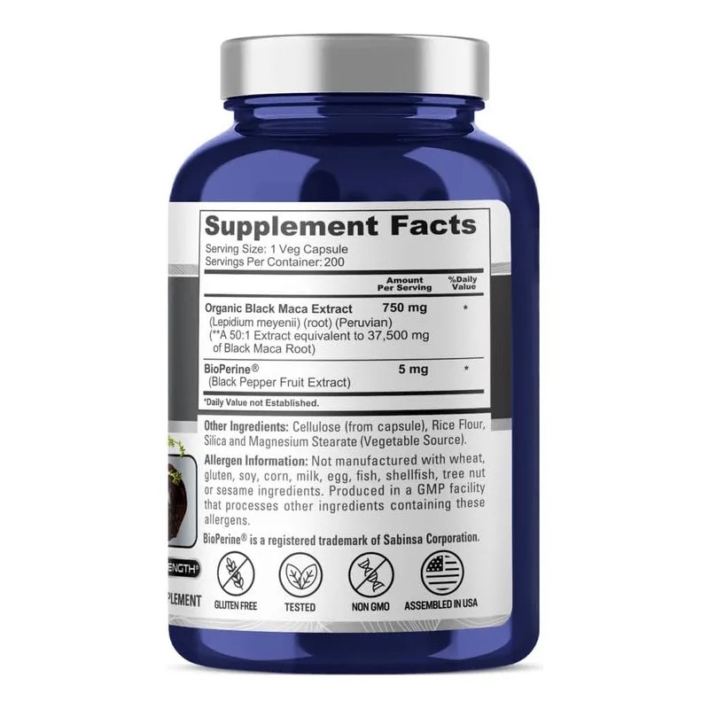 Suplemento de raíz de maca negra Nusapure 37.500 mg 200 cápsulas