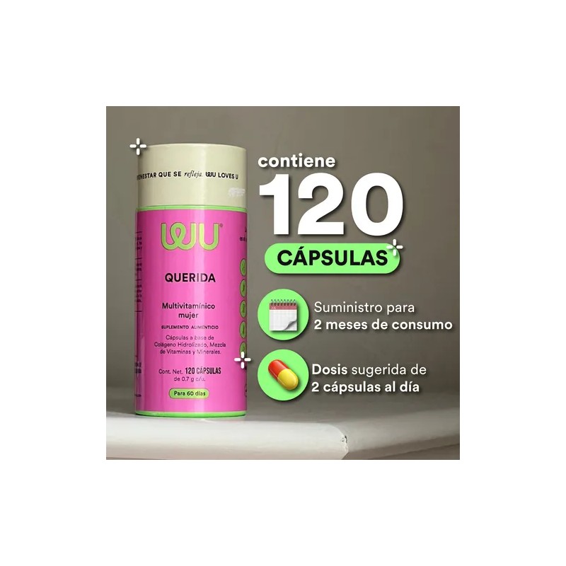 Suplemento Multivitaminico Mujer Querida Wu Nutrition 120 Capsulas Colágeno Hidrolizado Vitaminas y Minerales Biotina Acido Folico Calcio Magnesio Zinc Vitaminas C y D Bienestar
