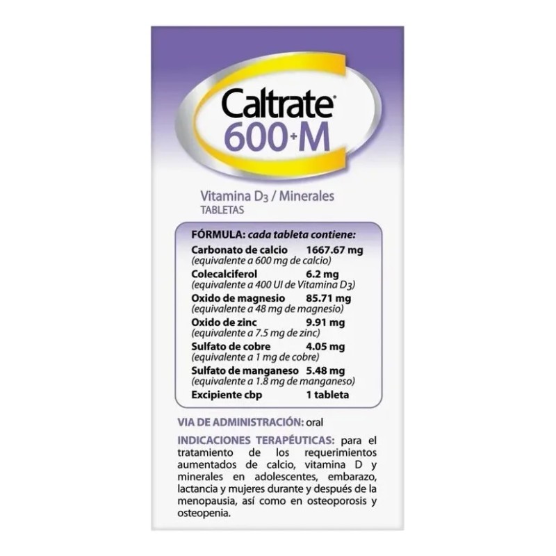 - Caltrate 600M contiene vitamina D3 y minerales esenciales para mejorar la absorción y fijación del calcio en los huesos