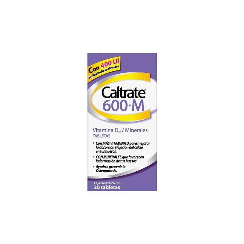 - Caltrate 600M contiene vitamina D3 y minerales esenciales para mejorar la absorción y fijación del calcio en los huesos
