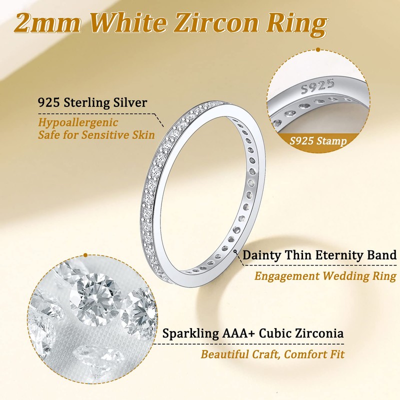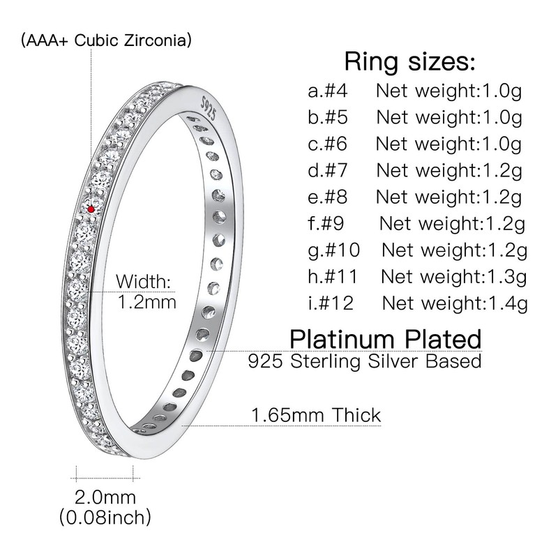 - RING DIMENSIONS --Band about 2mm wide, 1.65mm thick; stone about 1.2mm wide, available in us standard size 6 to 13. Simple cz eternity rings, nice weight, strong and durable, not out of shape. Very comfortable, very shiny, and very romantic.