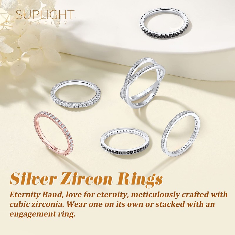 Suplight 925 Sterling Silver Eternity Rings, Stackable Cubic Zirconia Rings Fake Wedding Band CZ Womens Rings Size 7