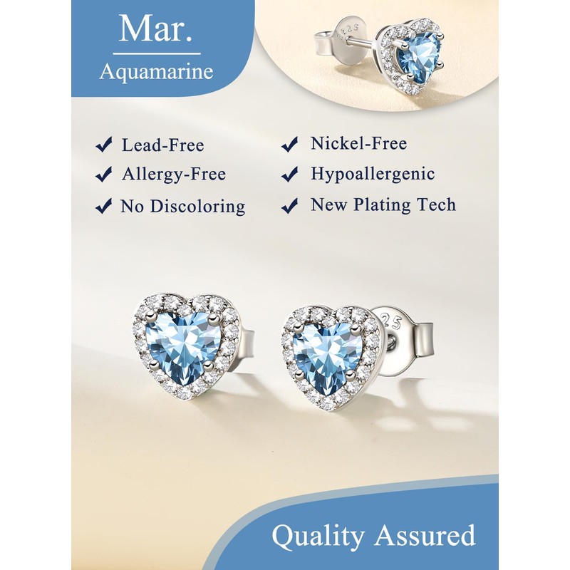 - HALO EARRINGS: 925 stamped sterling silver heart birthstone cz stud earrings from January to December. Earrings size: 7.5mm wide/7.2mm Net weight: 1.3g