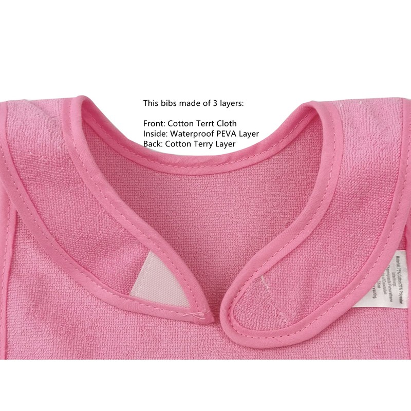 - Waterproof Bibs : A Waterproof PEVA Layer Insert Between 2 Terry Layers, Water Resistent, to Protect Clothing from Drool, Milk, and Other Liquids, and an Absorbent Layer to Catch any Food that May Fall from the Baby's Mouth.