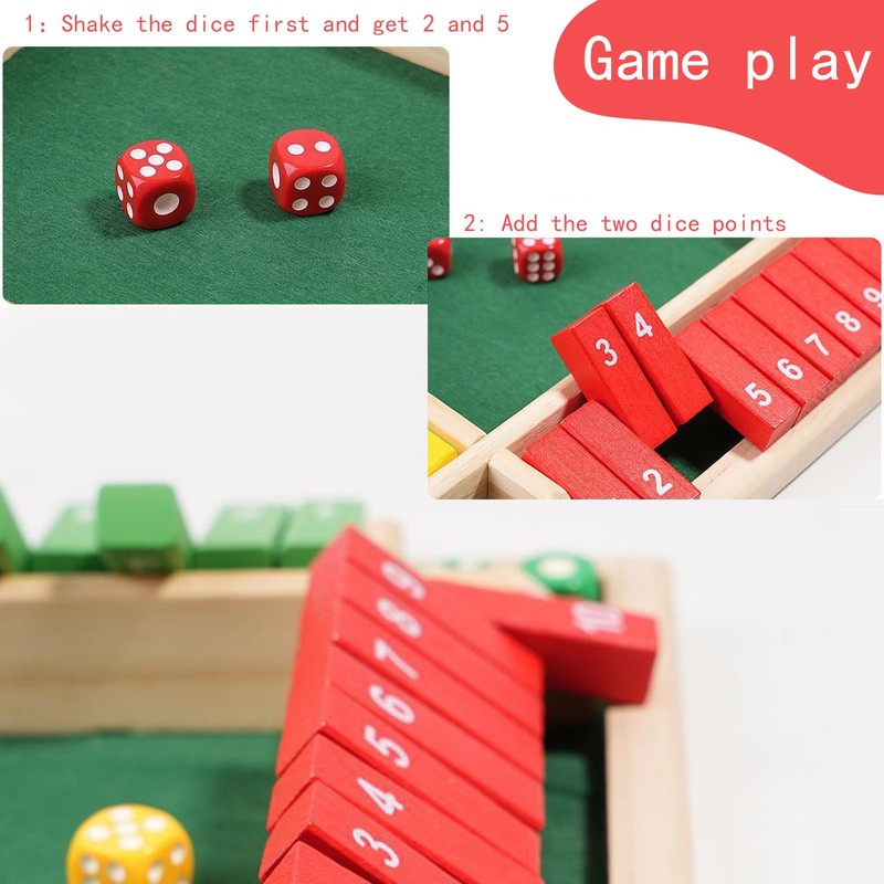 2. Everyone plays the dice first, and the player then plays with the rule "Closing and Subtracting (+-×)". If you throw 10 points, you need to turn any number of cards and 10. Each player can turn 1 to 3 cards at once, but the sum of the numbers must be equal to 10. Example: you can transfer 1 + 9, 2 + 8, 3 + 7, 4 + 6, 1 + 2 + 7 cards or 4, 5, 2 (4 × 5 = 20 ÷ 2 = 10) cards. The sum of the remaining cards is the score of each player, and the one who scores the lowest score wins.