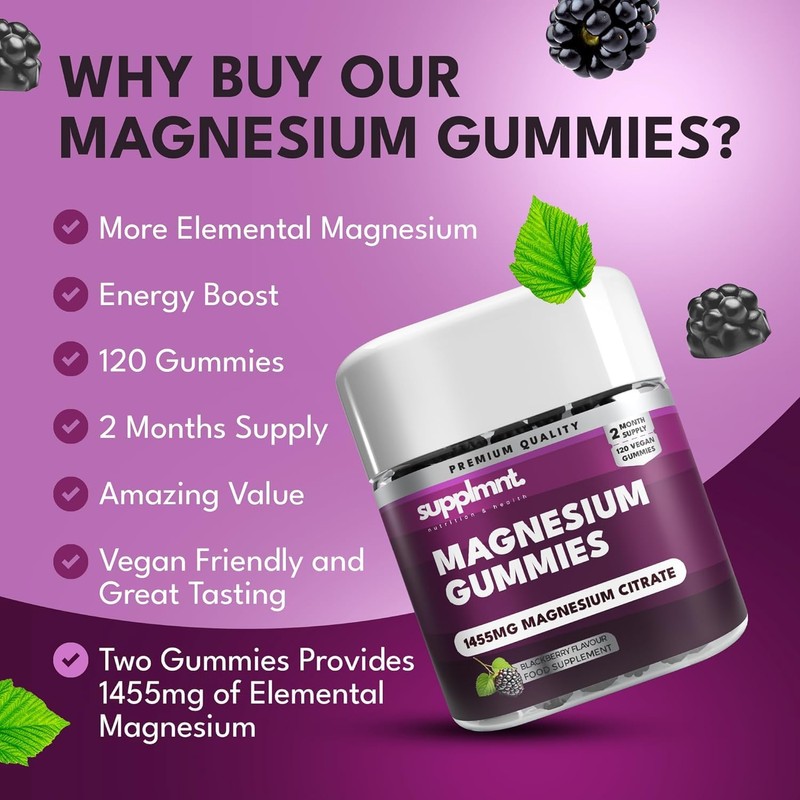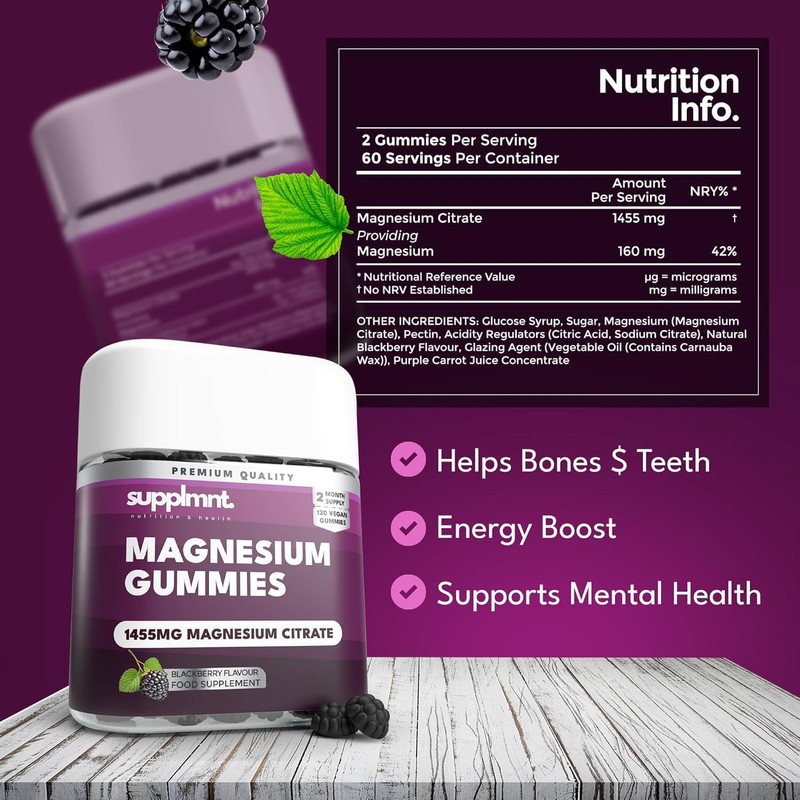 Product descriptionDiscover the ultimate solution to magnesium supplementation with SUPPLMNT. Magnesium Gummies! Packed with 1455mg of highly absorbable Magnesium Citrate per serving, these delicious Blackberry flavoured gummies are designed to support your active lifestyle. Magnesium is great for reducing fatigue, maintaining normal muscle and nerve function, and promoting restful sleepall vital for overall health. Unlike other magnesium supplements, our gummies are crafted for convenience and taste, ensuring no more struggles with swallowing pills. Made with care, these vegan, Halal-certified, and gluten-free gummies are perfect. Choose SUPPLMNT. and invest in your well-being with a supplement that's as effective as it is enjoyable. Order now to experience the difference!IngredientsGlucose syrup, Sugar, Magnesium (Magnesium Citrate), Pectin, Acidity Regulators (Citric Acid, Sodium Citrate), Natural Blackberry Flavour, Glazing Agent (Vergetable Oil (Contain Carnauba Wax),DirectionsAdults 18 years and over. Take 2 gummies per daySafety WarningDo not exceed recommended dose. Pregnant or nursing mothers, children under the age of 18 and indivaduals with a known medical condition should consult their GP or physician before using this food supplement.
