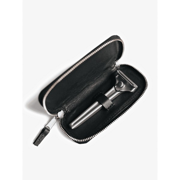 The Supply Single Edge Travel Case in Midnight Black is a full-grain leather travel case designed to protect your Single Edge razor while on the go.