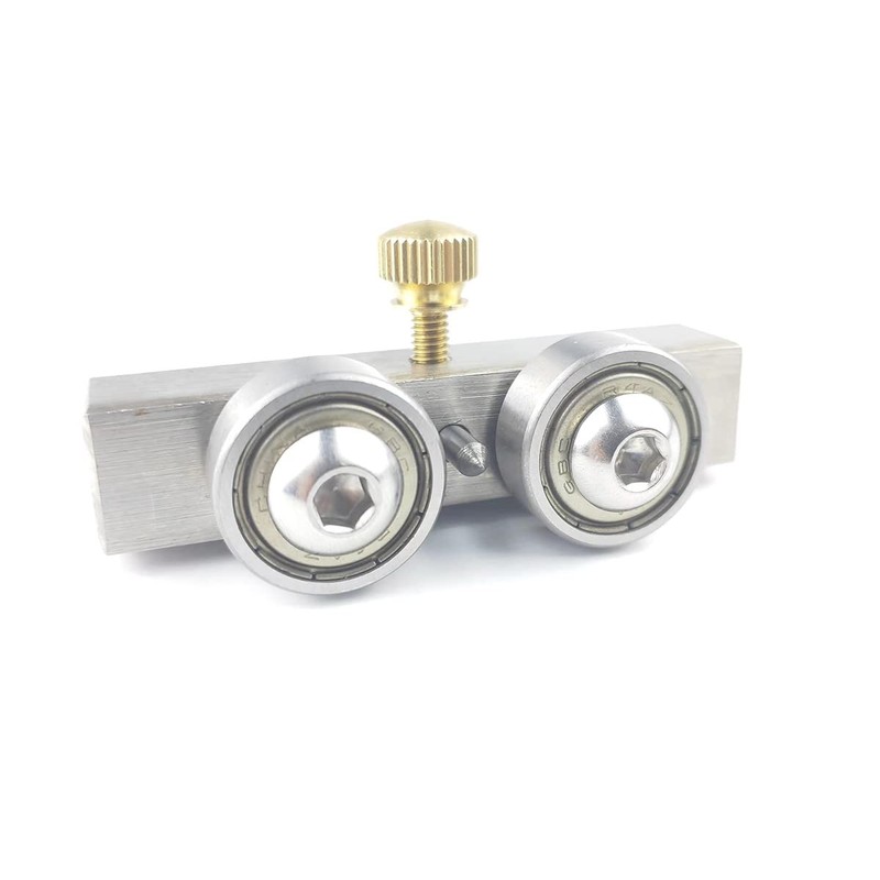- The spacing between the bearings when assembled is about 0.282 (9/32"), so this can easily scratch the 1/4" stock. The steel body is completely finished. No drilling or threading is required. The device will scribe any thickness from zero to 1/4" thick. You rotate the scribe on the workpiece until the bearings touch each side. This is a self-centering design.