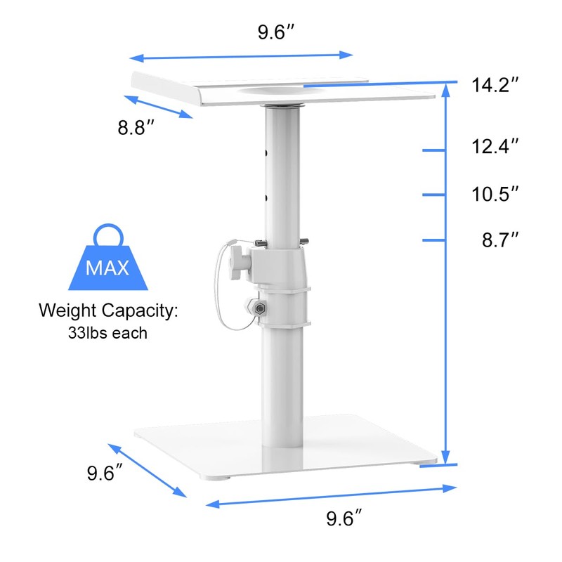- Adjustable - raise your speaker to eye level with 4-level locking pole (8.7/10.5/12.4/14.2” to the desk). Then adjust the tray to the ideal projection angle with +12° to -12° tilting capability.