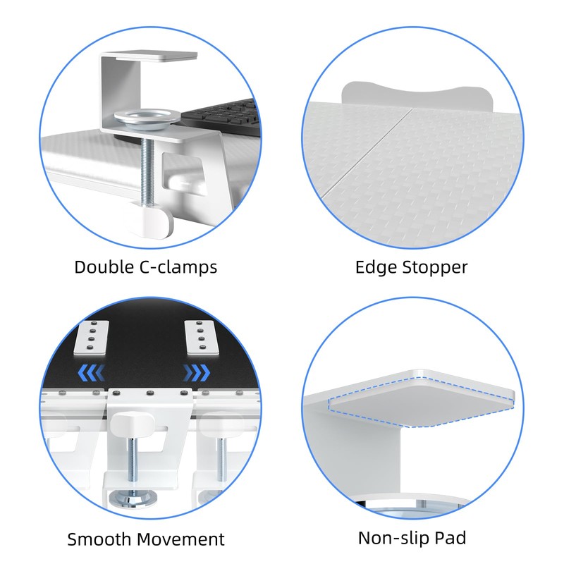 - Sturdy - Dual Steel C-clamps can tightly fix to your desk and holds up to 11lbs. Non-slip pads prevent your desk from scratching. Edge stopper can stop keyboard from falling when pushing back.