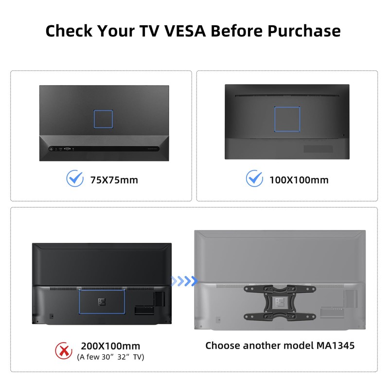 - Read before purchase: this bracket ONLY fit VESA 75x75mm and 100x100mm. If the VESA patern is over 100x100mm, we will recommend another model.