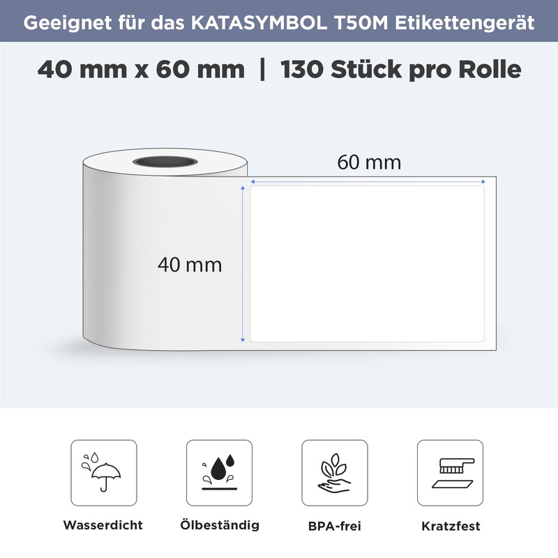 SUPVAN KATASYMBOL T50M Pro/Plus Label Tape Paper, Waterproof Labels for Home, School, Office, 40 mm x 60 mm, 130 Labels/Roll, Black on White