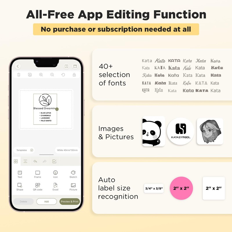 - Versatile App Editing Function: Free to use 140+ ready-to-use templates, 40 fonts, 30 frames, and 450+ icons; Design your own labels and save the frequently used label templates, quick and easy