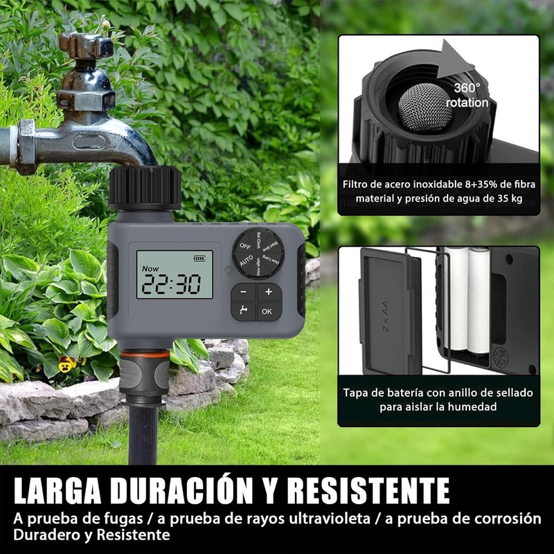 Hecho con materiales de alta calidad, resistentes a la intemperie, este temporizador de riego está diseñado para durar. Puede soportar diferentes condiciones climáticas, desde el calor intenso hasta las lluvias torrenciales, sin comprometer su rendimiento. -