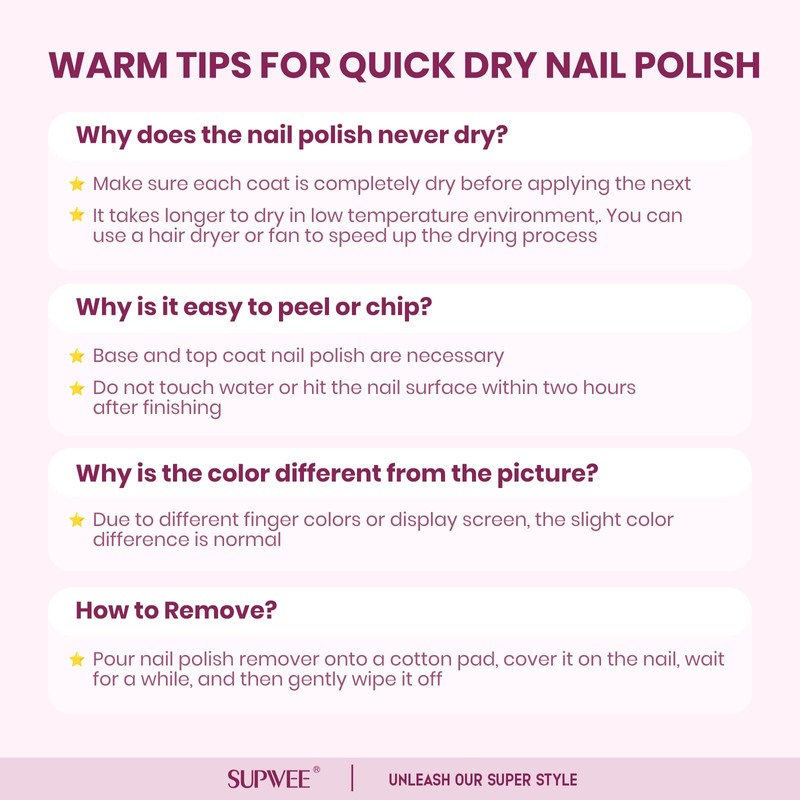 - Important Tips: 1. Make sure each coat is completely dry before applying the next; 2. Do not touch water or hit the nail surface within two hours after finishing to avoid peeling; 3. Base and top coat nail polish art necessary