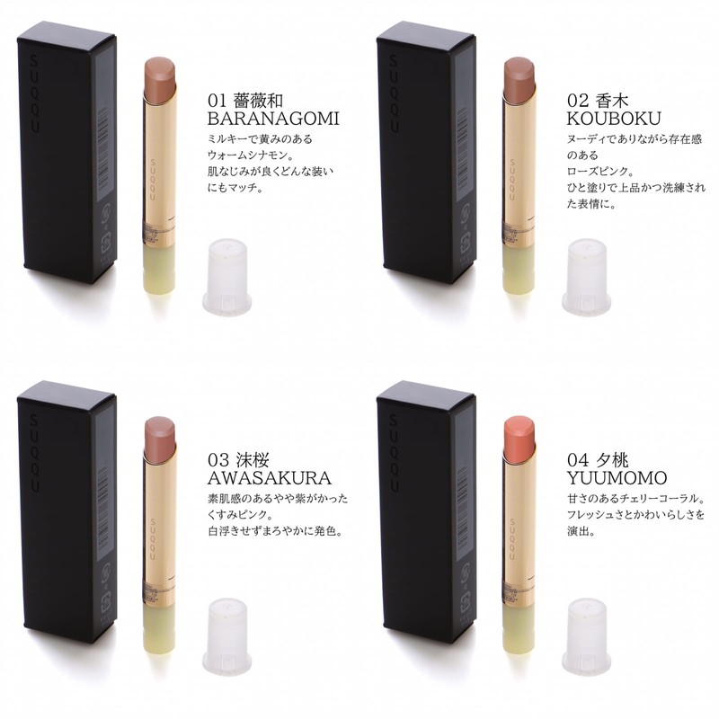 - 01 ROSEWA BARANAGOMI: Milky and yellow warm cinnamon. 02 KOUBOKU: Rose pink with a nude yet presence. 03 Sakura -AWASAKURA: A slightly purplish dull pink with a bare skin. 04 Peach -YUUMOMO: Sweet Cherry Coral. 05 Anzuharu -ANZUBARE: Healthy color with gold over terracotta