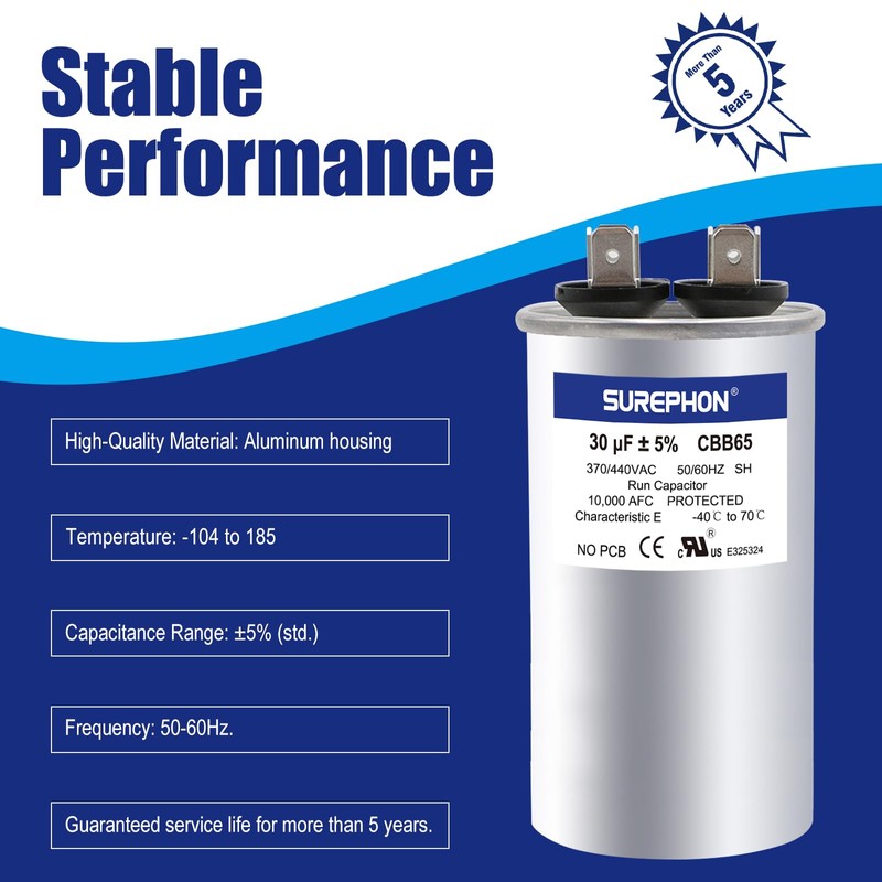 - SUREPHON CBB65 30uf ±5% ac capacitor replacement for 370/440 Volt capacitors, A Class, 10000 AFC.