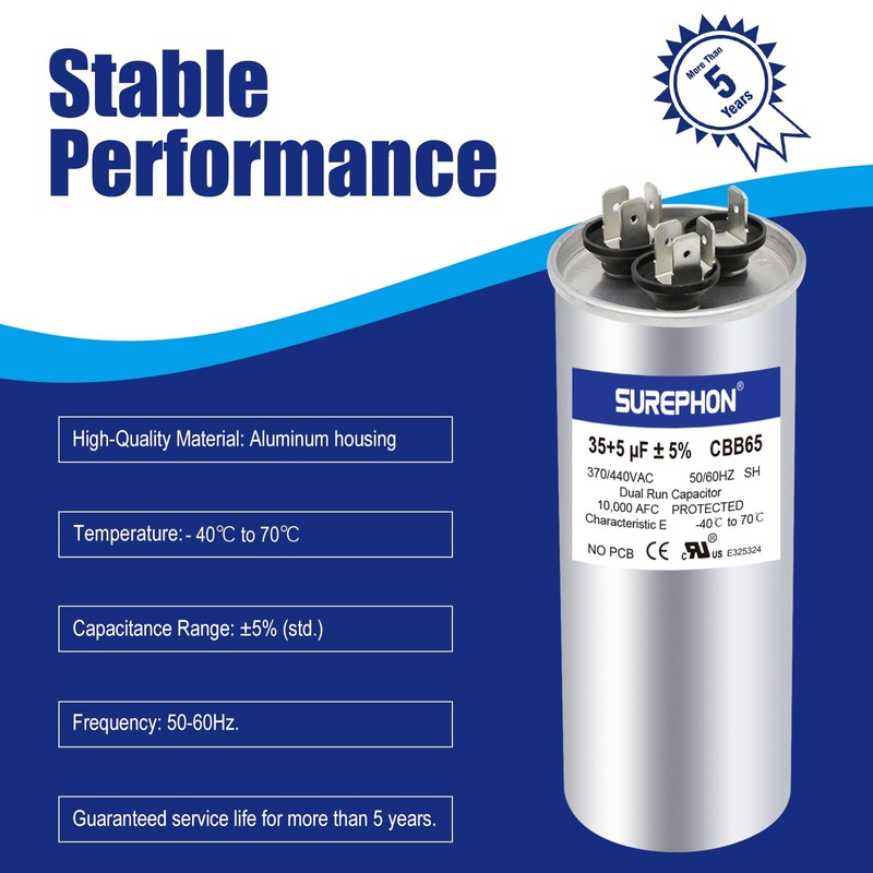 SUREPHON 35+5 uF 35/5 MFD ±5% 370V/440VAC Dual Run Start Capacitor CBB65 Works for AC Unit Fan Motor Start or Heat Pump or Condenser Straight Cool